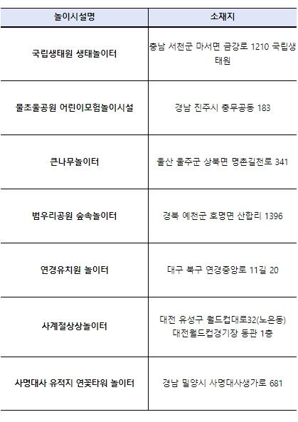 [중앙뉴스라인, 장성대기자] 안전하고 모험적이며, 어린이들이 충분히 쉴 수 있는 올해의 우수 어린이놀이시설로 충남 서천군 국립생태원 생태놀이터 등 7개소가 선정됐다.