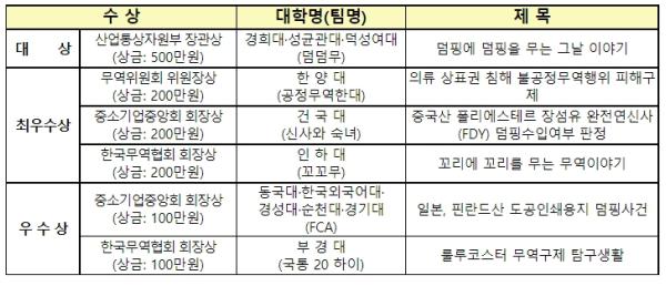 최우수상에는 ‘공정무역한대’ 팀(한양대)의 ‘의류 상표권 침해 불공정무역행위 피해구제’, ‘신사와 숙녀’ 팀(건국대)의 ‘중국산 폴리에스테르 장섬유 완전연신사(FDY) 덤핑수입여부 판정’, ‘꼬꼬무’ 팀(인하대)의 ‘꼬리에 꼬리를 무는 무역이야기’ 등 3팀이 선정됐다.
