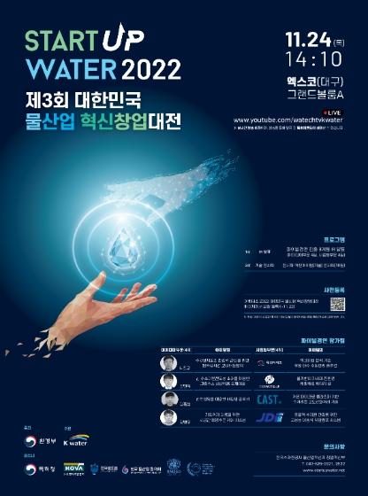 [중앙뉴스라인, 장성대기자] 환경부와 한국수자원공사(사장 박재현)는 국내 물산업 혁신창업 활성화를 위해 대한민국 국제물주간(11월 23~25일) 행사와 병행하여 11월 24일 오후 대구 엑스코에서 ‘제3회 대한민국 물산업 혁신창업 대전’을 개최한다.