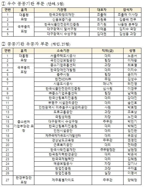 포상 규모는 총 3개 부문 50점으로, 우수공공기관 5개, 공공기관 유공자 27명, 모범 중소기업인 18명이다.