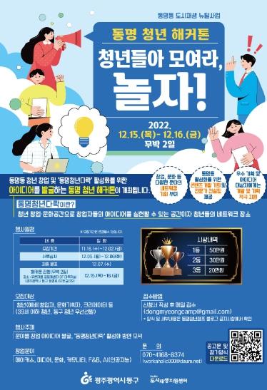 해커톤 참여자 중 최종 심사를 거쳐 대상 1팀(50만 원), 최우수상 1팀(30만 원), 우수상 1팀(20만 원) 우수 아이디어 3팀을 선정한다. 선정된 3팀은 후속으로 진행되는 ‘동명 청년 캠프’ 프로그램에 우선 참여 기회가 제공된다.