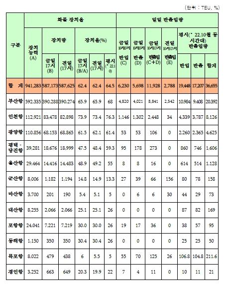 전국 12개 항만 컨테이너 반출입량 감소(평시대비 33%)가 지속되고 있어 수출입 및 환적화물 처리에 차질이 누적 중이다.
