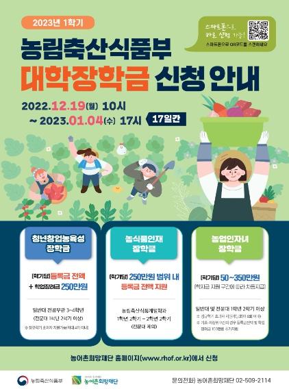 2023학년 1학기 농식품 분야 인재 장학금을 신청하고자 하는 학생은 2022년 12월 19일 10시부터 2023년 1월 4일 17시까지 농어촌희망재단 누리집에 신청서를 제출하여야 한다.