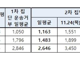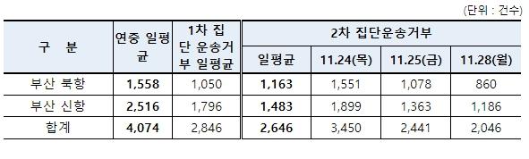 특히, 부산항의 컨테이너 반출입은 평시 대비 43.3% 수준이고, 수출신고 건수도 ’22년(1∼10월) 일평균 4,074건 대비 집단운송거부 첫날인 11.24(목) 3,450건, 11.25(금) 2,441건, 11.28(월) 2,046건으로 줄어들고 있어 집단운송거부로 인한 물류차질이 수출 감소로 직결될 우려가 큰 상황이다.