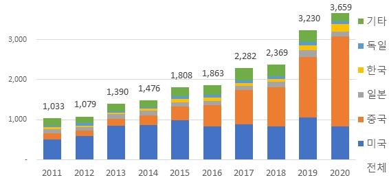 출원인의 국적별로는, 미국이 40.8%(8,228건)로 가장 많고, 중국 35.5%(7,175건), 일본 5.8%(1,169건) 순이었다. 우리나라는 3.8%(776건)로 4위를 차지했으며, 독일이 3%(602건)로 5위였다.