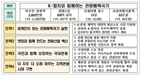 이번 계획은 △세계인이 찾는 관광매력국가 실현, △현장과 함께 만드는 관광산업 혁신, △국민과 함께 성장하는 국내관광, △독창적인 관광자원 육성으로 지역경제 활성화 등 4대 전략별로 과제를 추진하며, ’27년 기준 외국인 관광객 3,000만명, 관광수입 300억 달러, 국내여행 일수 15일, 국내여행지출액 50조원을 목표로 한다.