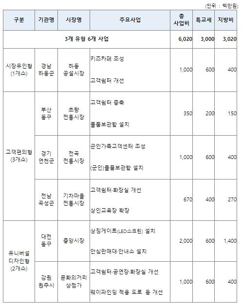 선정된 전통시장 6곳에는 총 60억 원(지방비 포함)을 지원할 예정이며, 경남 하동군 공설시장, 부산 동구 초량전통시장, 전남 곡성군 기차마을시장, 경기 연천 전곡전통시장 등 4곳은 인구소멸지역의 시장이다.