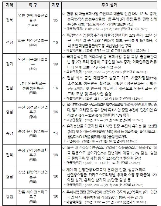 중소벤처기업부는 전국 184개 특구를 대상으로 ’21년 운영성과와 실적을 평가해 최우수특구로 ‘영천 한방·마늘산업특구’, 우수특구로 ‘화순 백신산업특구’ 및 ‘안산 다문화마을특구’ 등 9개 우수특구를 선정했다.