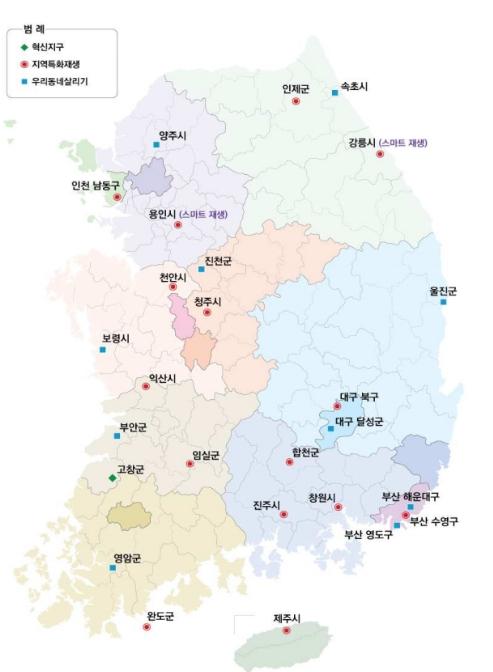 선정된 주요 사업지의 사업 내용은 다음과 같다.1) 기존 공모유형이 아닌 지역이 가진 자원과 특성에 따라 맞춤형 재생을 할 수 있는 지역특화재생 15곳을 새로이 추진한다.