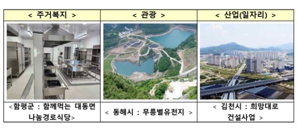 이번 우수사례 경진대회는 지역개발사업을 ①주거?복지, ②관광, ③산업(일자리) 분야로 구분해 3건의 최우수사례와 3건의 우수사례를 선정하였다.
