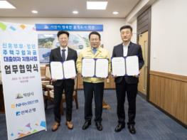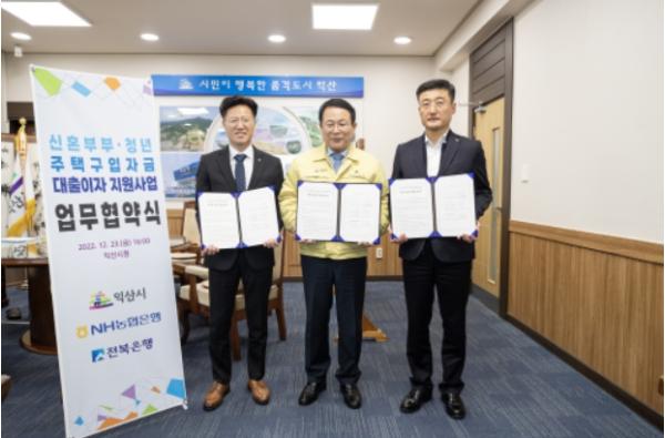 시는 23일 NH농협은행, 전북은행과‘신혼부부?청년 주택 구입자금 대출이자 지원사업’을 추진하기 위한 업무협약을 체결했다. 이날 협약식에는 정헌율 시장과 이상우 농협은행 익산시지부장, 김창주 전북은행 익산지점 센터장이 참석했다.