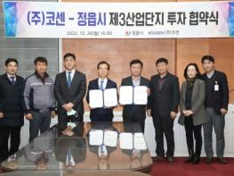 정읍시와 ㈜코센은 26일 정읍시청 중회의실에서 이학수 시장과 김광수 대표를 비롯한 양 기관 관계자들이 참석한 가운데 ㈜코센 정읍공장 신축 투자를 위한 협약을 체결했다.