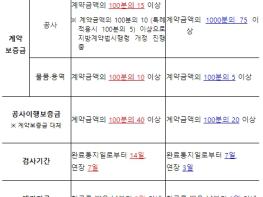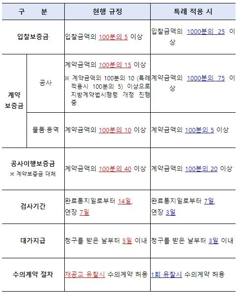 입찰보증금은 입찰금액의 5% 이상에서 2.5% 이상으로, 물품?용역 계약보증금은 계약금액의 10% 이상에서 5% 이상으로 인하되며, 공사이행보증서 제출금액도 계약금액의 40% 이상에서 20% 이상으로 낮아진다.