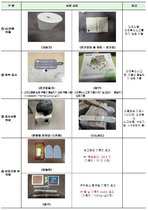 안전기준 위반 유형은, △관련 법령상의 안전 인증 미획득(약 19만 개), △안전 표시사항 허위기재(약 11만 개), △안전 표시기준 불충족(약 2만 개), △기준치 초과 등 국내 안전기준 부적합(약 1만6천 개) 순으로 나타났다.