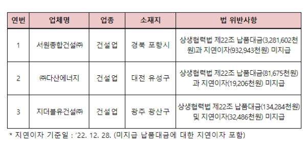 반면, 개선요구 조치에 응하지 않은 3개사에 대해서는 회사명과 상생협력법 위반 사실 등을 28일 공표(중소벤처기업부 누리집 등)하고, 공정거래위원회에 하도급법 위반 관련 조치를 요구했다.