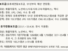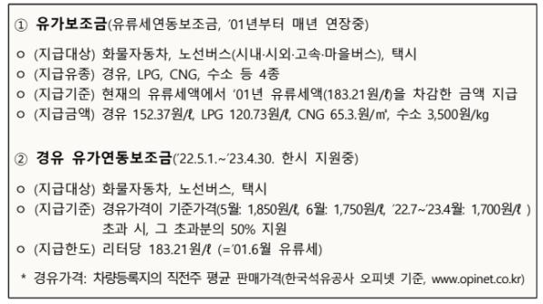 정부는 화물자동차, 노선버스 및 택시의 유류세 부담을 경감하기 위하여경유, LPG, CNG 및 수소에 대하여 유가보조금(유류세연동보조금)을 지원하여 왔으나(?22년 1조 3,583억원), 올해는 국제유가 상승으로 교통·물류업계의 어려움이 가중됨에 따라 5월부터 경유에 대하여 유가연동보조금을 추가로 한시 지원하고 있다(?22년 3,550억원).