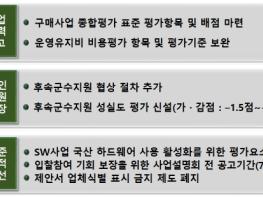 업체의 입찰참여 기회를 충분히 보장할 수 있도록 사업설명회 전까지의 입찰공고기간을 국가계약법의 공사입찰의 현장설명일 전까지의 공고기간과 동일하게 7일을 부여하고, 제안업체에 대한『제안서 업체식별 표시 식별 금지』제도는 업체의 불필요한 업무경감 및 과도한 규제개선 차원에서 폐지했다.
