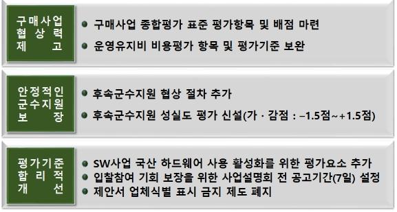 이와 더불어 소프트웨어 개발사업인 전장관리정보체계 사업을 추진함에 있어 서버, 네트워크 등의 상용 국산 정보통신 장비의 사용을 권장하기 위해 『국산 상용 하드웨어 도입』을 평가요소로 추가했으며,