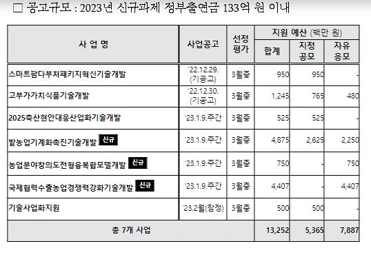 [중앙뉴스라인, 장성대기자] 농림축산식품부는 1월 3일, 2023년도 농식품 연구개발사업 시행계획을 통합공고한다고 밝혔다. 총 7개 사업에 약 133억 원이 지원되며, 이 중에는 2023년 신규 사업 예산 100억 원이 포함되어 있다.