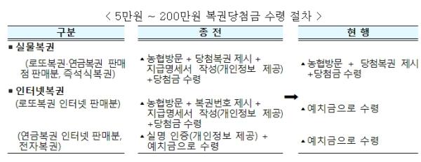 그간 5만원 ~ 200만원 사이 당첨금 수령을 위해서는 주민등록번호 등 과세를 위한 개인 정보를 제공(지급명세서 작성)해야 했으나, 금년부터는 이러한 복잡한 절차 없이 곧바로 은행을 방문하여 당첨금 수령 가능하다.