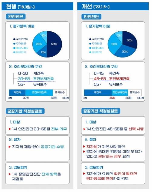 [중앙뉴스라인, 장성대기자] 국토교통부는 지난 ?재건축 안전진단 합리화방안(‘22.12.8)?의후속 조치로 1월 5일부터 ?주택 재건축 안전진단 기준? 및 ?도시?주거환경 정비계획 수립지침?을 개정?시행한다고 밝혔다.