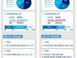 (조건부 재건축범위 조정) 그동안 평가점수가 30~55점 이하이면 조건부재건축 판정을 받았으나, 조건부재건축 범위를 45~55점 이하로 조정하여 45점 이하는 즉시 재건축 받도록 판정범위를 합리화하였다.