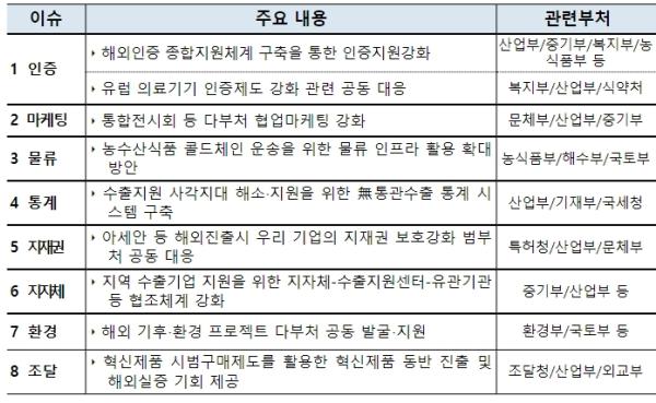 이외에도, 통합전시회 등 협업마케팅 강화(문체부/산업부/중기부), 농수산식품 콜드체인 운송을 위한 물류인프라 확충(농식품부/해수부/국토부), 수출지원 사각지대 해소를 위한 무통관수출 통계시스템 구축 및 지원(산업부/기재부/중기부/국세청 등), 해외진출 시 지재권 보호강화를 위한 범부처 대응(특허청/산업부/문체부) 등 주요 협업과제에 대한 구체적 이행계획을 마련하여 신속히 추진해 나가기로 했다.