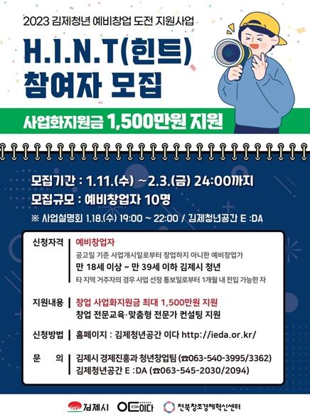 시는 김제청년 예비창업 도전 지원사업‘힌트’를 통해 만 18세 이상 39세 이하 예비 창업가 10명을 모집하여 소모성 인테리어 및 경영지원 등에 필요한 창업 사업화 지원금을 최대 1,500만 원까지 지원한다.