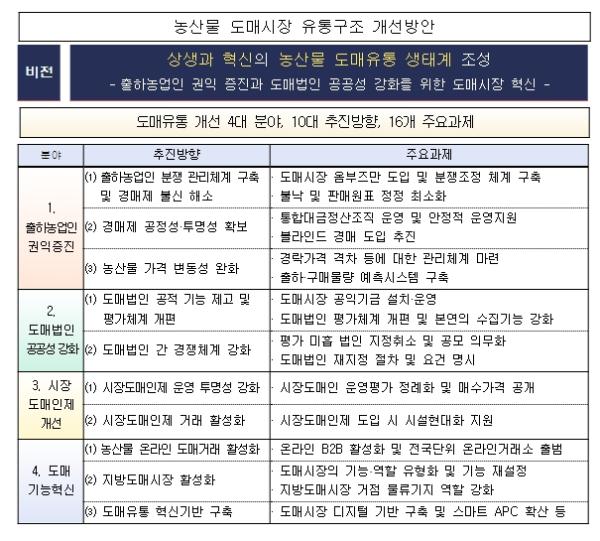 이에 농식품부는 그간 도매유통 구조개선에 대한 농업인과 소비자들의 요구와 전문가·유통주체 의견수렴 등*을 토대로 ?출하 농업인의 권익증진, ?도매법인의 공공성 강화, ?시장도매인제 평가·개선, ?도매시장 기능혁신의 4대 분야를 지정하고 10대 추진방향과 16개 주요과제를 선정했다.