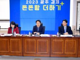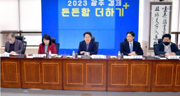 강 시장은 18일 오후 광주경제고용진흥원에서 제7차 민생경제대책본부회의를 열어 ‘2023 광주 경제, 든든함 더하기+’ 정책 전략을 발표했다. 강 시장은 올해의 경제전략 발표에 이어 소상공인 지원책, 중소기업 수출 판로 확대 등 경제 위기 돌파구 마련을 위해 유관기관과 머리를 맞댔다.