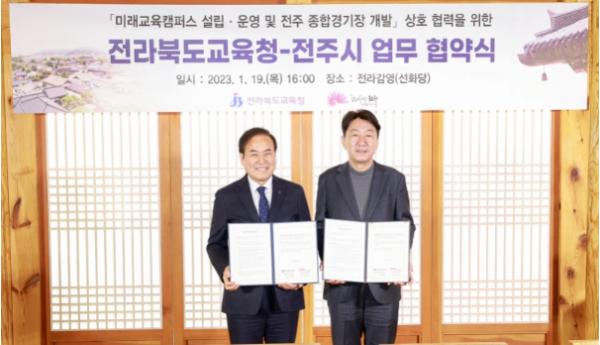 서거석 전북교육감과 우범기 전주시장은 19일 조선시대 전라도의 행정·군사·사법을 관할했던 전주의 상징적 공간인 ‘전라감영’에서 ‘미래교육캠퍼스 설립-종합경기장 개발사업’의 상호 협력을 약속하는 업무협약(MOU)을 체결했다.