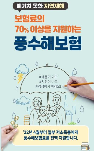 풍수해보험은 행정안전부가 관장하는 정책보험으로 정부가 보험료의 70% 이상(최대 100%)을 지원하고 있으며, 태풍 및 호우 등 9개 유형의 자연재난로 인한 재산피해 손해를 보상해주고 있다.
