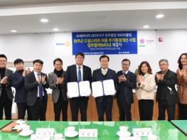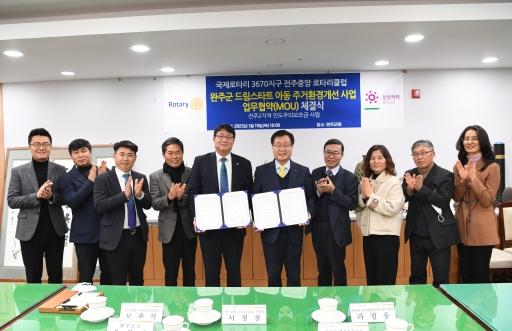 20일 완주군에 따르면 유희태 완주군수와 모종석 전주중앙로타리클럽 회장은 전날 오후 군청 4층 전략회의실에서 ‘완주군 드림스타트 아동 주거환경개선 사업 업무협약(MOU)’을 체결했다.