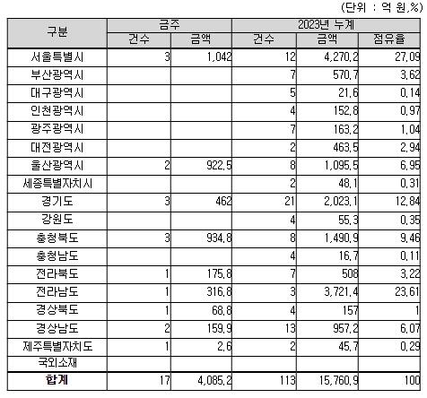 이번 주 집행예정인 17건 중 14건은 지역제한 입찰 또는 지역의무 공동도급 대상공사로, 1,652억 원 상당(40%)을 지역업체가 수주할 수 있을 것으로 예상된다.