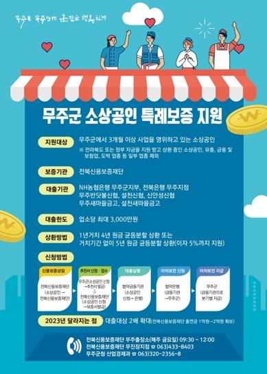 [중앙뉴스라인, 정영철기자] 무주군이 경영난을 겪고 있는 소상공인들의 경영 부담을 덜어주기 위해 특례보증 지원으로 힘을 실어준다. 신용등급 부족으로 대출에 어려움을 겪고 있는 관내 소상공인에게 전북신용보증재단과 협약을 통해 신용보증 대출을 해줌으로써 지역내 소상공인의 경제안정과 지역경제활성화에 기여하기 위한 취지다.
