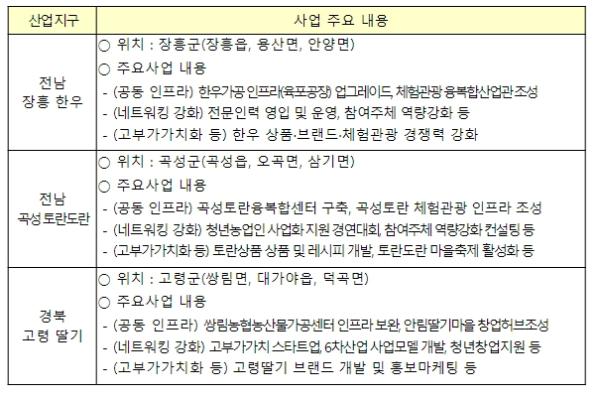 농촌융복합산업지구 조성사업 선정 대상 지자체는 ‘전남 장흥(한우)’, ‘전남 곡성(토란)’ ‘경북 고령(딸기)’ 등 3개소이다.