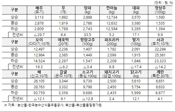 [중앙뉴스라인, 장성대기자] 농림축산식품부는 설 명절 이후 농축산물 가격은 생산이 감소한 양파 및 최근 한파 영향으로 출하량이 감소한 오이 등 일부 채소류를 중심으로 다소 높게 형성되고 있으나, 주요 농축산물(18개 품목)의 1월 하순 소비자가격은 전년 대비 1.9% 낮은 수준이라고 밝혔다.