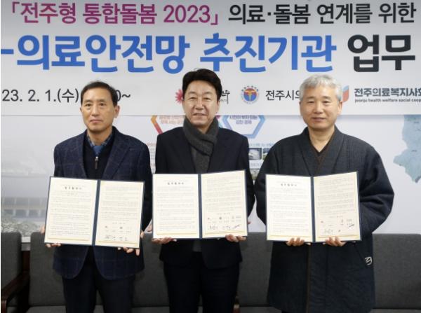 시는 1일 전주시장실에서 우범기 전주시장과 정경호 전주시의사회장, 김권희 전주의료복지사회적협동조합 이사장, 김신선 전주시보건소장 등이 참석한 가운데 ‘전주형 통합돌봄 2023’의 건강-의료안전망 사업 추진을 위한 업무협약을 체결했다.