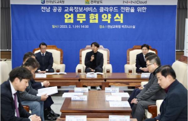 [중앙뉴스라인, 장성대기자] 전라남도교육청이 2월 1일 청사 내 비즈니스실에서 전라남도·NHN클라우드와 전남 공공 교육정보서비스 클라우드 전환을 위한 업무협약(MOU)을 체결했다.