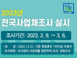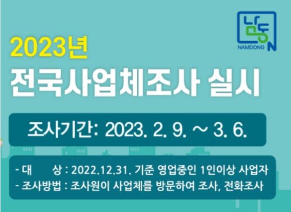 [중앙뉴스라인, 송상교기자] 인천시 남동구는 오는 9일부터 3월 6일까지 ‘2023년 사업체 조사’를 실시한다고 3일 밝혔다.