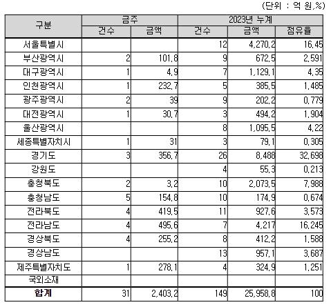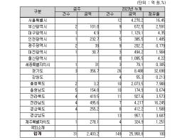지역별로는 전라남도 496억 원, 전라북도 420억 원, 경기도 357억 원, 그 밖의 지역이 1,130억 원이다.