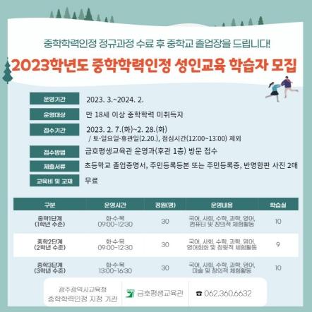 광주광역시교육청 금호평생교육관, 2023학년도 중학학력인정 성인교육 학습자 모집