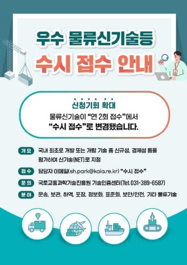 [중앙뉴스라인, 장성대기자] 국토교통부는‘우수 물류신기술’을 활성화하기 위해 상·하반기 연 2회 접수 방식에서‘수시 접수’로 변경한다.