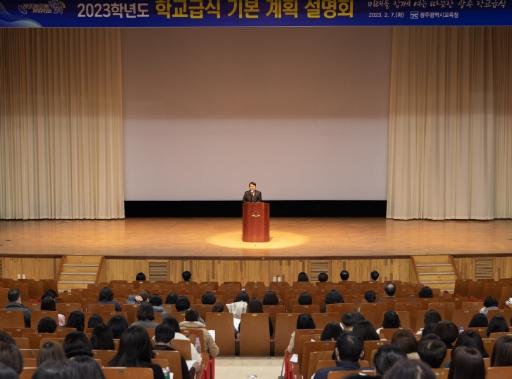 7일 시교육청에 따르면 이날 2023학년도 학교급식 기본계획 설명회를 개최했다. 설명회는 광주 학교급식의 주요 정책방향과 안전하고 건강한 학교급식 운영을 위해 알아야 할 내용을 안내하기 위해 마련됐다. 단설유치원을 포함해 광주 관내 전체 학교(원)장, 행정실장, 영양교사, 영양사 500여 명이 참석했다.