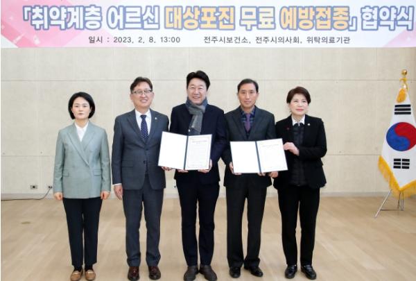 시는 8일 덕진보건소 강당에서 우범기 전주시장과 이기동 전주시의회 의장, 정경호 회장을 비롯한 전주시의사회 관계자, 지정 접종 위탁의료기관 대표 등이 참석한 가운데 65세 이상 취약계층 노인을 위한 대상포진 무료예방접종 지원사업 추진을 위한 업무협약을 체결했다.