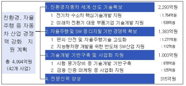 분야별로 살펴보면, 전기·수소차 등 친환경차 기술개발(2,293억원), 자율주행 등 디지털 분야(1,383억원), 기반구축·사업화 지원(1,003억원), 인력양성(315억원) 등 4개 분야에 걸쳐 311개 과제를 추진한다.
