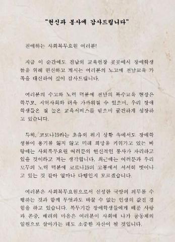 김대중 전남교육감, 특수학교 사회복무요원에게 감사 편지