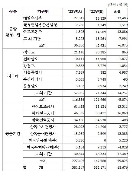 먼저, 기관 유형별 발주규모를 살펴보면, 공공기관은 전년 대비 약 6조원, 36% 증가한 22.7조원의 물량을 발주 예정이며, 이는 전체 집계치 38.1조원의 60%에 육박하는 규모다.
