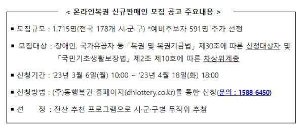 [중앙뉴스라인, 장성대기자] 기획재정부 복권위원회(위원장: 최상대 제2차관)는 2023년 2월 20일자로 복권 수탁사업자인 ㈜동행복권을 통해 장애인·국가유공자 등 우선계약대상자를 대상으로 하는 온라인복권(로또 6/45) 신규판매인 모집(1,715명) 공고를 했다.