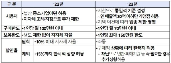 앞으로는 1인당 구매한도는 월 70만원 이하, 보유한도는 최대 150만원 이하의 범위에서 지자체가 정하도록 하여, 상품권이 더 많은 소상공인 매장에서, 더 자주 사용되도록 유도할 방침이다.